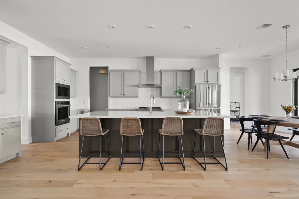 This home makes an impression the moment you step inside. A dramatic dual staircase and statement lighting open into a light-filled living space with soaring ceilings, a striking fireplace, and expansive glass that draws the outdoors in. The layout feels open and comfortable, designed to work just as well for everyday living as it does for entertaining. The kitchen sits at the heart of the home, anchored by a generous island, premium finishes, and thoughtful storage. It’s a space that functions beautifully whether hosting a crowd or enjoying a quiet morning. The primary suite offers a true retreat with a spa-inspired bath and a custom closet that feels more boutique than builder standard. More than $200,000 in upgrades are evident throughout the home, from custom flooring and designer tile to built-ins and carefully selected finishes that create a polished, cohesive feel. Additional spaces include a private office, game room, and media room, providing flexibility for work, play, and relaxation. The mudroom and laundry areas are equally well considered and add to the home’s overall ease of living. Located on a quiet street in Travisso, this home offers the same floor plan as the Toll Brothers model, fully completed and move-in ready. No waiting, no unfinished decisions, just a beautifully finished home ready to be enjoyed.
